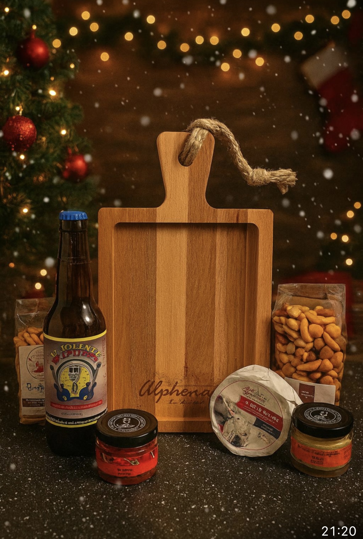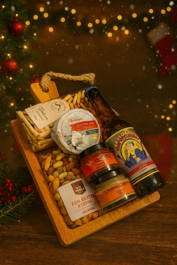 Met de warme borrelplank breng je sfeer, smaak en gezelligheid samen op tafel. Dit feestelijke kerstpakket bevat alles voor een onvergetelijke borrel: Een ambachtelijke houten serveerplank, een fles speciaalbier, romige geitenbrie, harttige dips en knapperige snacks. Perfect om te delen tijdens de feestdagen!