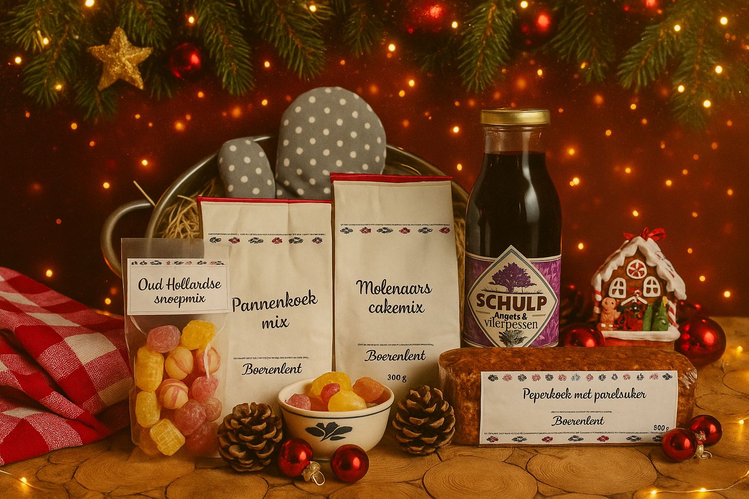 Met bakmixen, advocaat, Schulp sap, peperkoek en Oud-Hollandse snoepmix brengt dit pakket de geur en smaak van kerst in huis. Perfect om samen te bakken, te proeven en te genieten van echte gezelligheid.