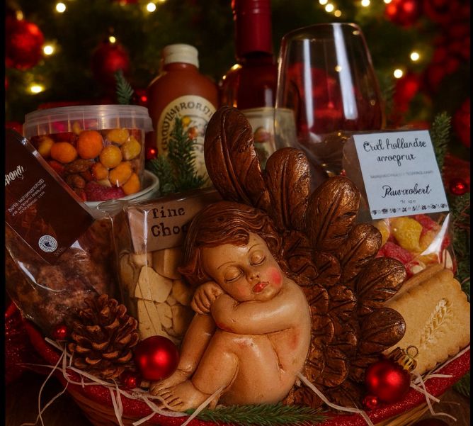 Met een exclusieve fles premium wijn en de verfijnde Chrobelair-specialiteit – samen al een waarde van €32 – straalt dit pakket pure klasse uit. Aangevuld met feestelijke lekkernijen en prachtig gepresenteerd in een warme kerstsfeer, is dit geschenk een ode aan samenzijn, smaak en kwaliteit.