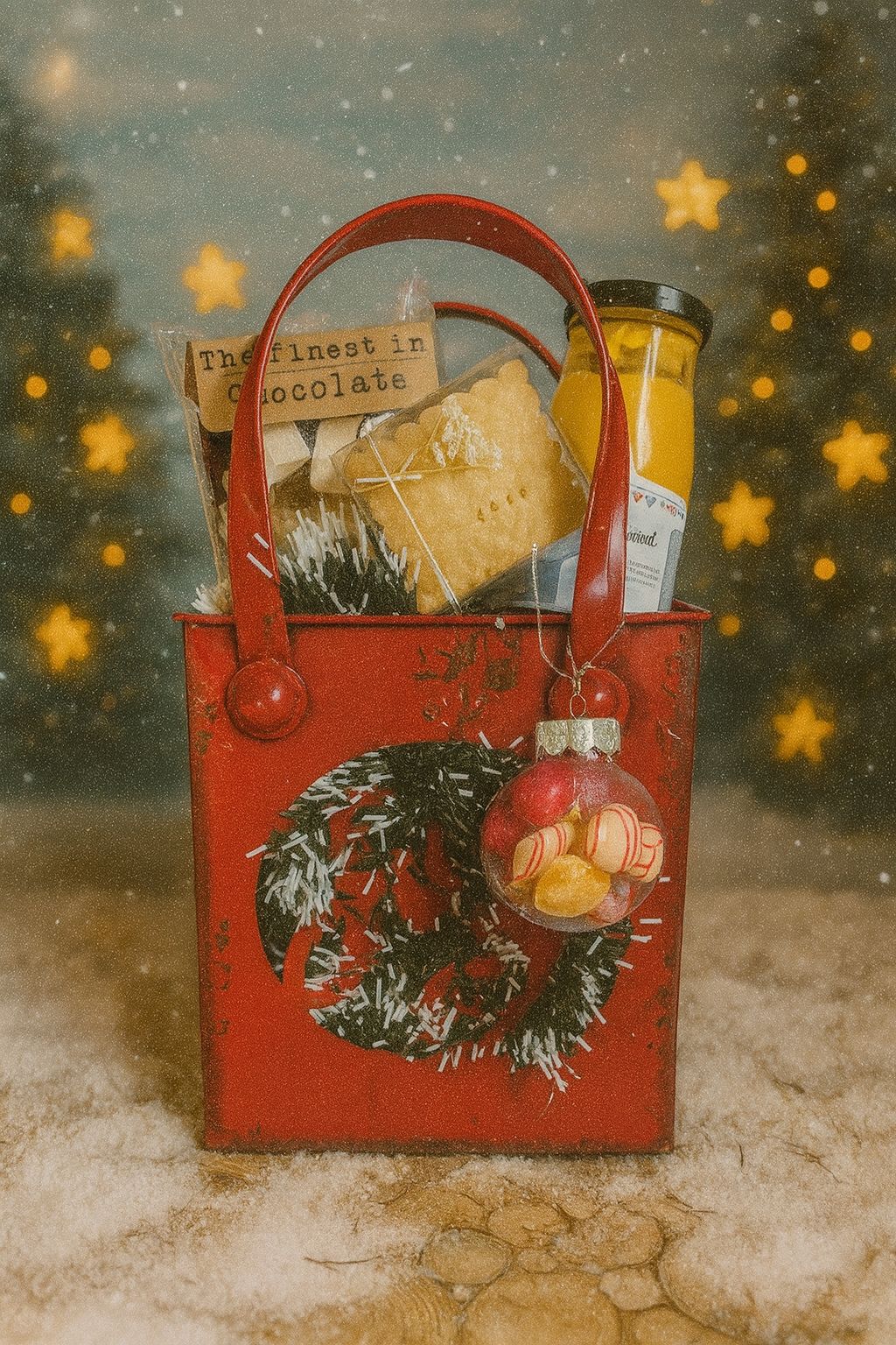 Geef dit jaar een kerstcadeau dat verrast! Het Kersttaske is een stijlvol rood ijzeren tasje, gevuld met heerlijke lekkernijen zoals ambachtelijke chocolade, een feestelijk koekje, een flesje advocaat en een speelse snoepbal. Aangevuld met wintergroen en kerstdecoratie straalt dit pakket warmte en gezelligheid uit.