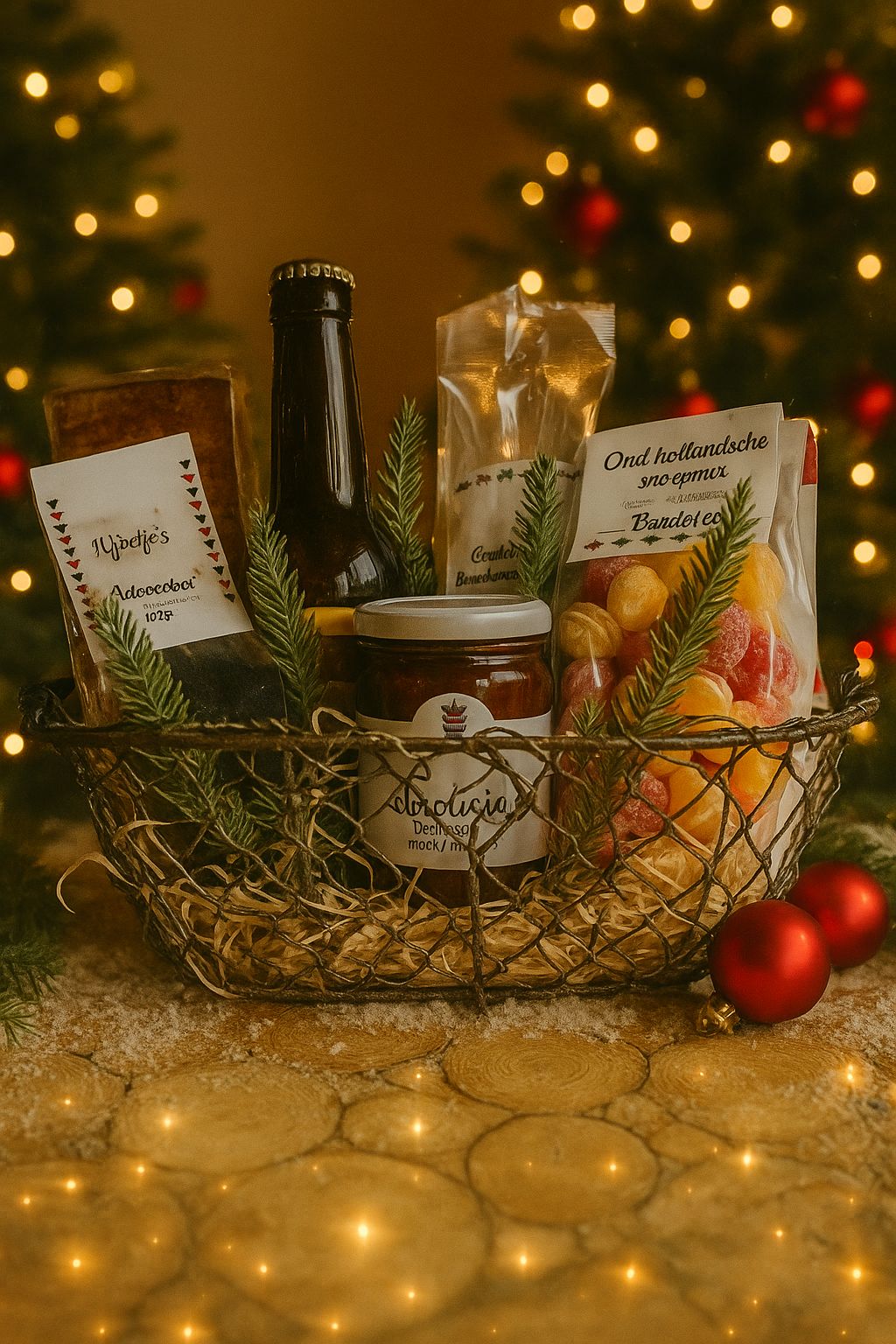 Maak deze kerst onvergetelijk met kerstmandje aan de Grens. Dit feestelijke pakket is rijk gevuld met ambachtelijke lekkernijen, hartverwarmende drankjes en zoete verrassingen. Alles stijlvol verpakt in een herbruikbare mand die gezelligheid en warmte uitstraalt.